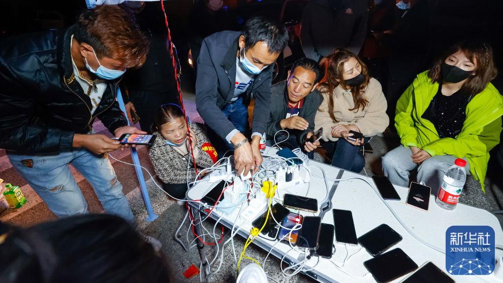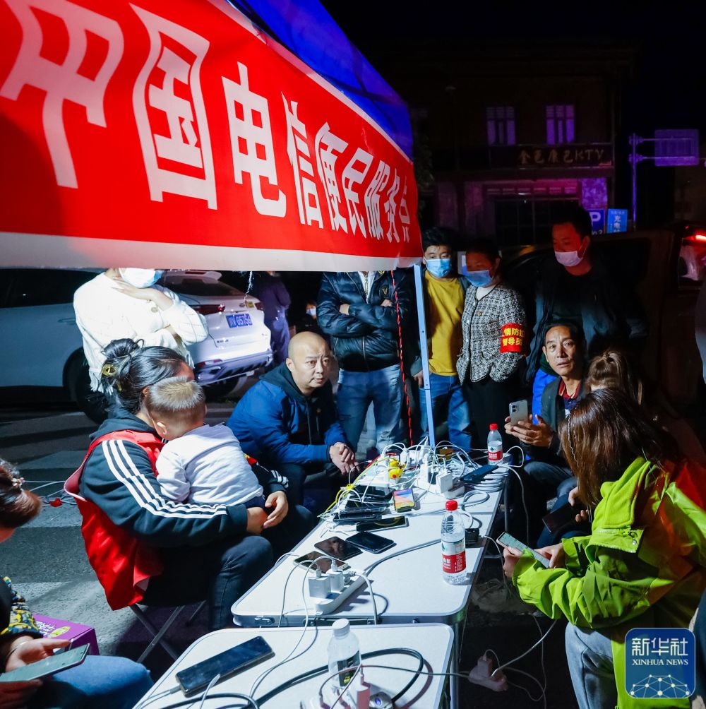 9月5日晚,在四川甘孜州泸定县磨西镇的受灾群众临时安置点,人们在中国电信便民服务点为手机充电。