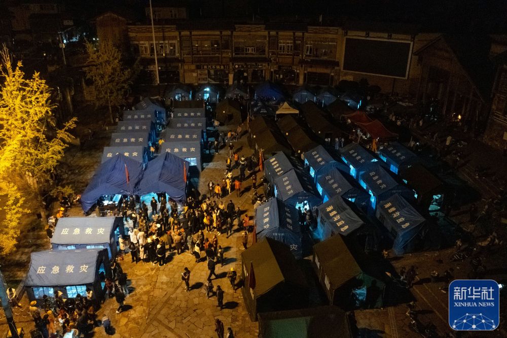 9月5日晚在四川甘孜州泸定县磨西镇拍摄的受灾群众临时安置点(无人机照片)。