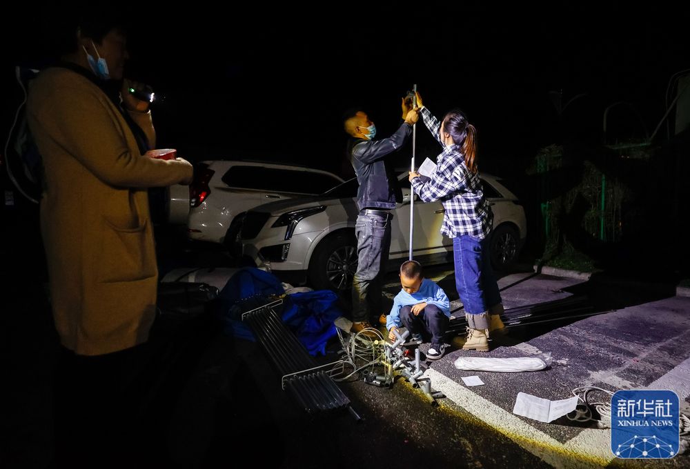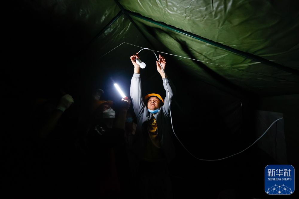 9月5日晚,在四川甘孜州泸定县磨西镇的受灾群众临时安置点,工作人员安装电灯。
