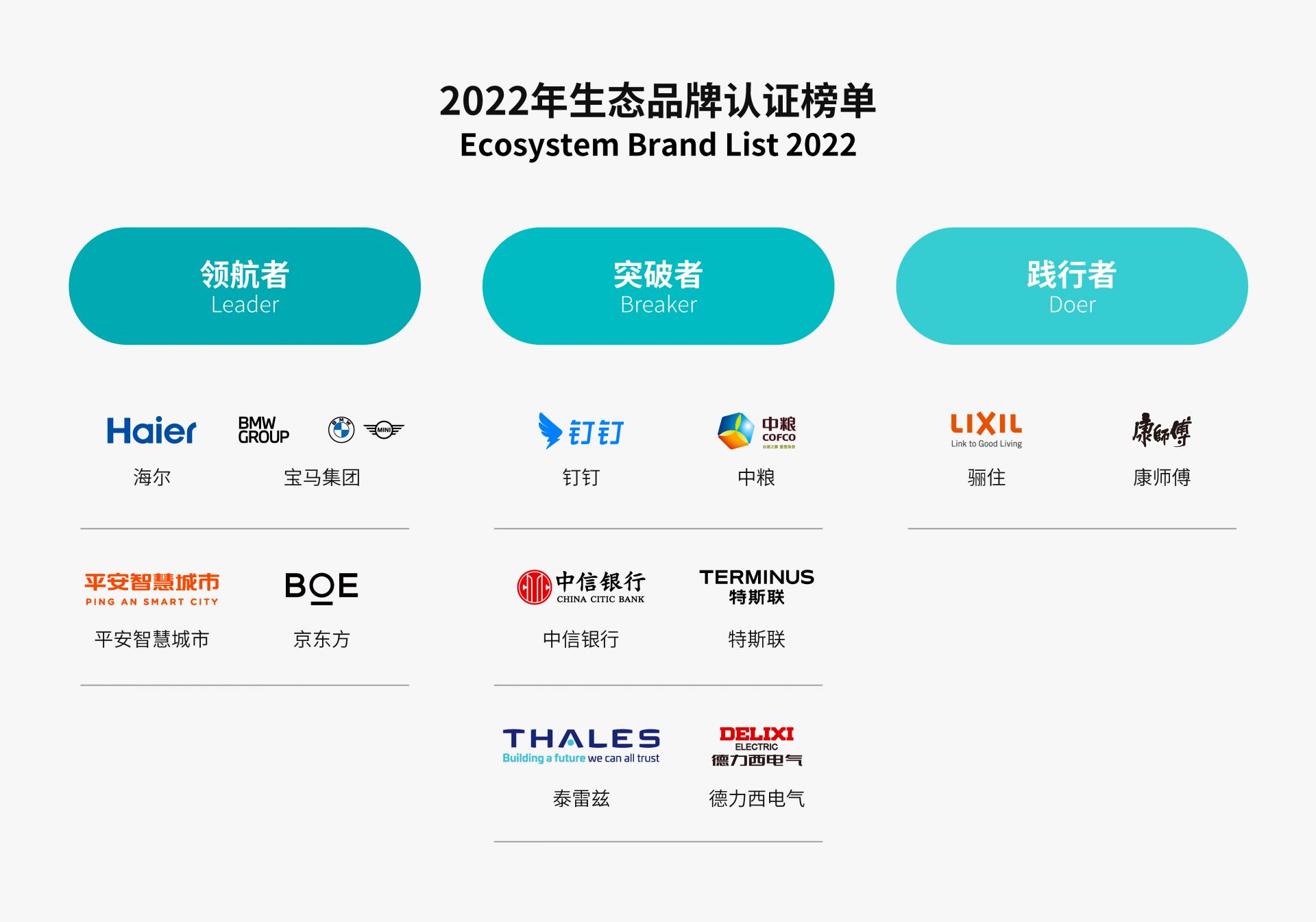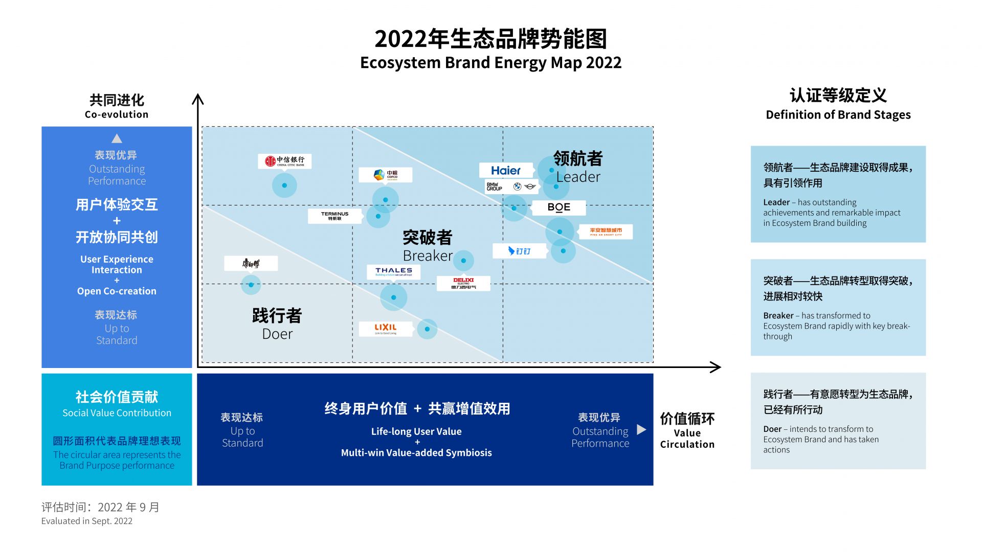 2022年3月,凯度集团携手牛津大学赛德商学院、《财经》杂志共同发起“生态品牌认证”,吸引了众多渴望释放品牌潜能的企业的关注,有近百家企业及品牌申报生态品牌认证,覆盖日常消费品、可选消费品、金融、工业、运输、能源、信息技术等诸多行业领域。9月6日,2022第一届生态品牌峰会以“生态,重新定义品牌”为主题,发布了“2022年生态品牌势能图”。其中,海尔、宝马集团、京东方、平安智慧城市4家品牌凭借引领性的生态品牌建设成果,获评“领航者”。