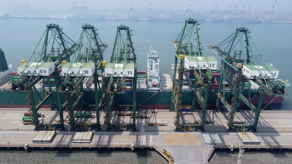 7月14日,一艘货轮停靠在天津港太平洋国际集装箱码头(无人机照片)。新华社记者 赵子硕 摄