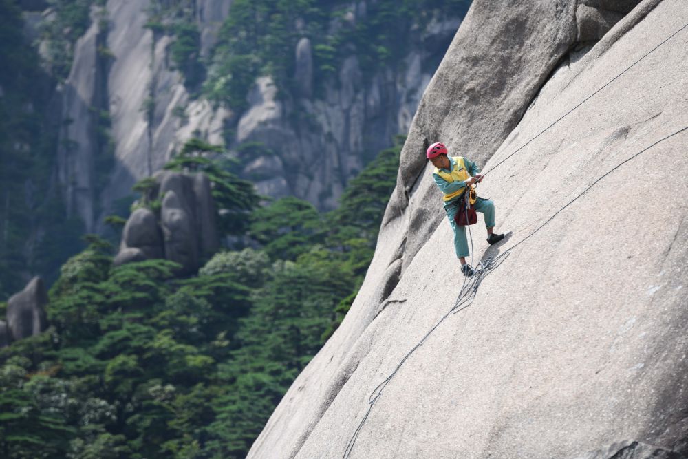 8月14日,李培生在黄山风景区的悬崖峭壁间清捡垃圾。李培生是黄山风景区玉屏环卫所的一名放绳工。他常年攀爬在悬崖峭壁间清理垃圾或帮助游客捡拾失物,在责任区内与同事一起巡查清捡。20多年来,李培生累计放绳长度达1800公里,相当于200多座珠穆朗玛峰的高度。2012年,李培生被评为“中国好人”。新华社记者 张端 摄