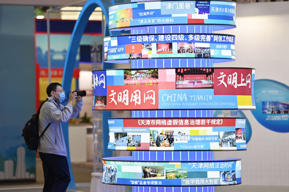 8月28日,在国家会展中心(天津),参会者在2022年中国网络文明大会现场拍摄展览。新华社记者 李然 摄