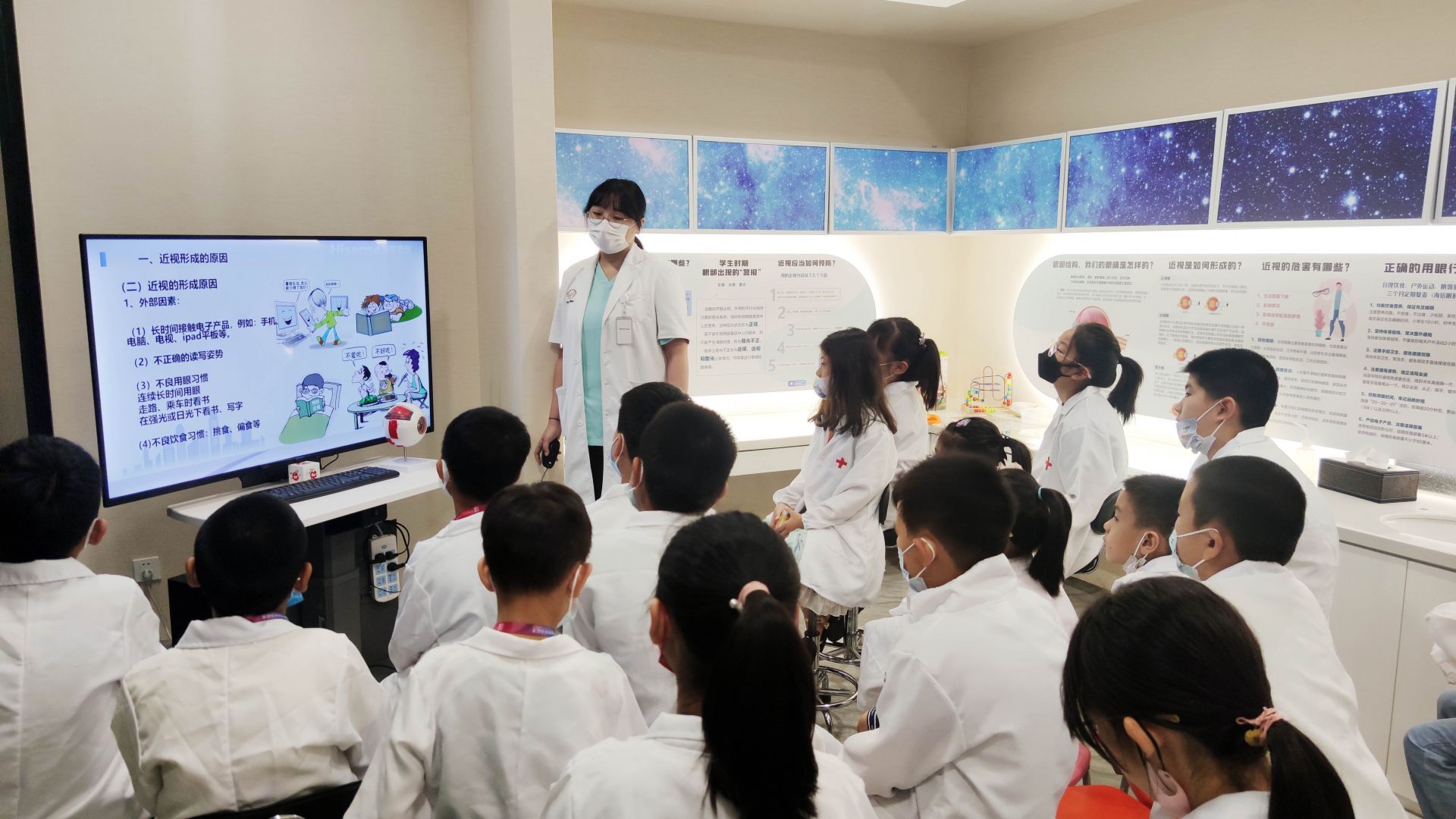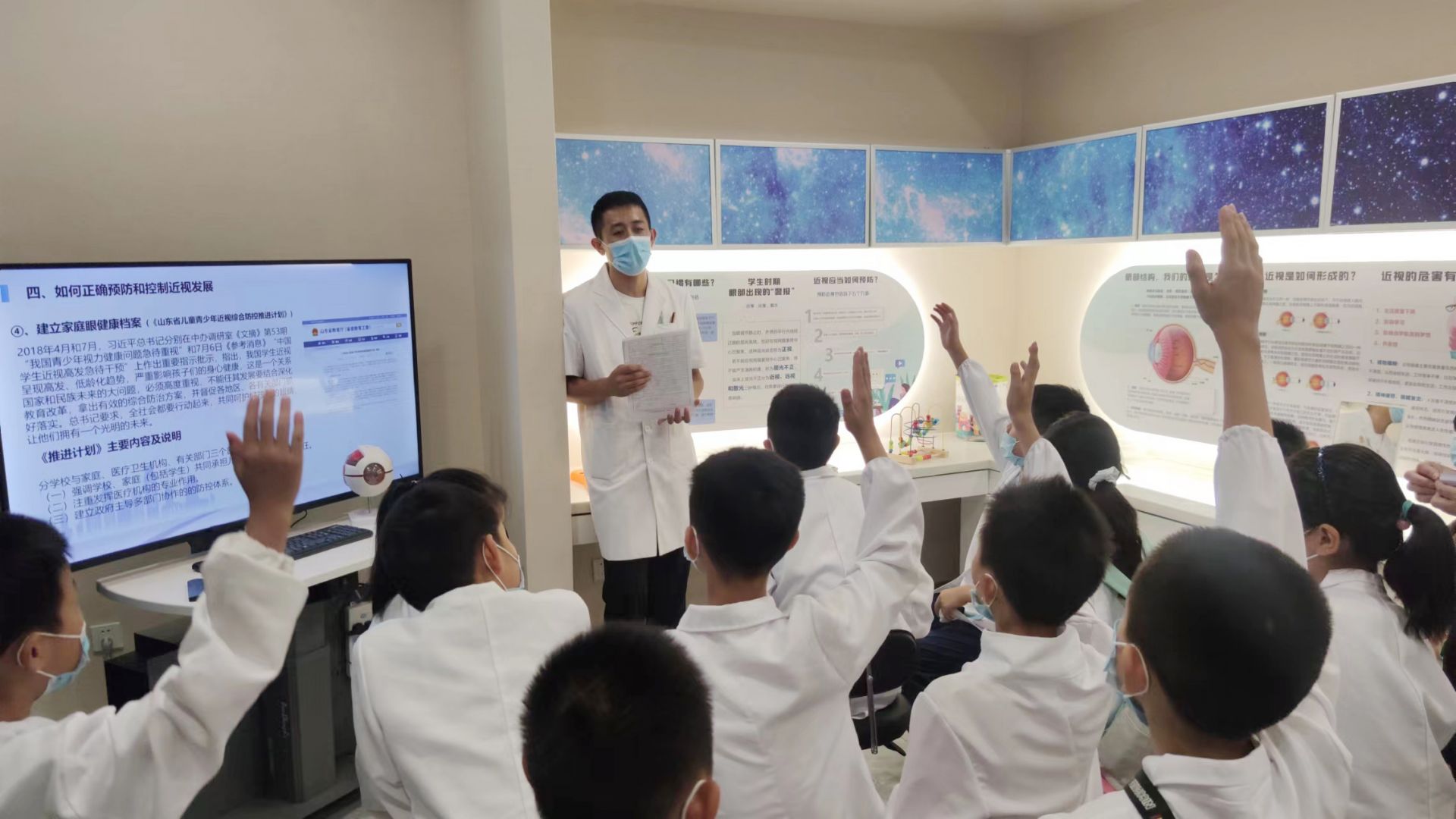 眼科专家向小记者们讲解了青少年儿童近视是如何发生、发展,如何预防近视等话题:根据现在的近视趋势,小学低年级学生是近视高危人群。因此近视预防工作要从小做起,从现在做起。在互动环节,眼科专家还就这堂知识讲座的内容向小记者们提问,小记者们踊跃举手,积极回答问题。