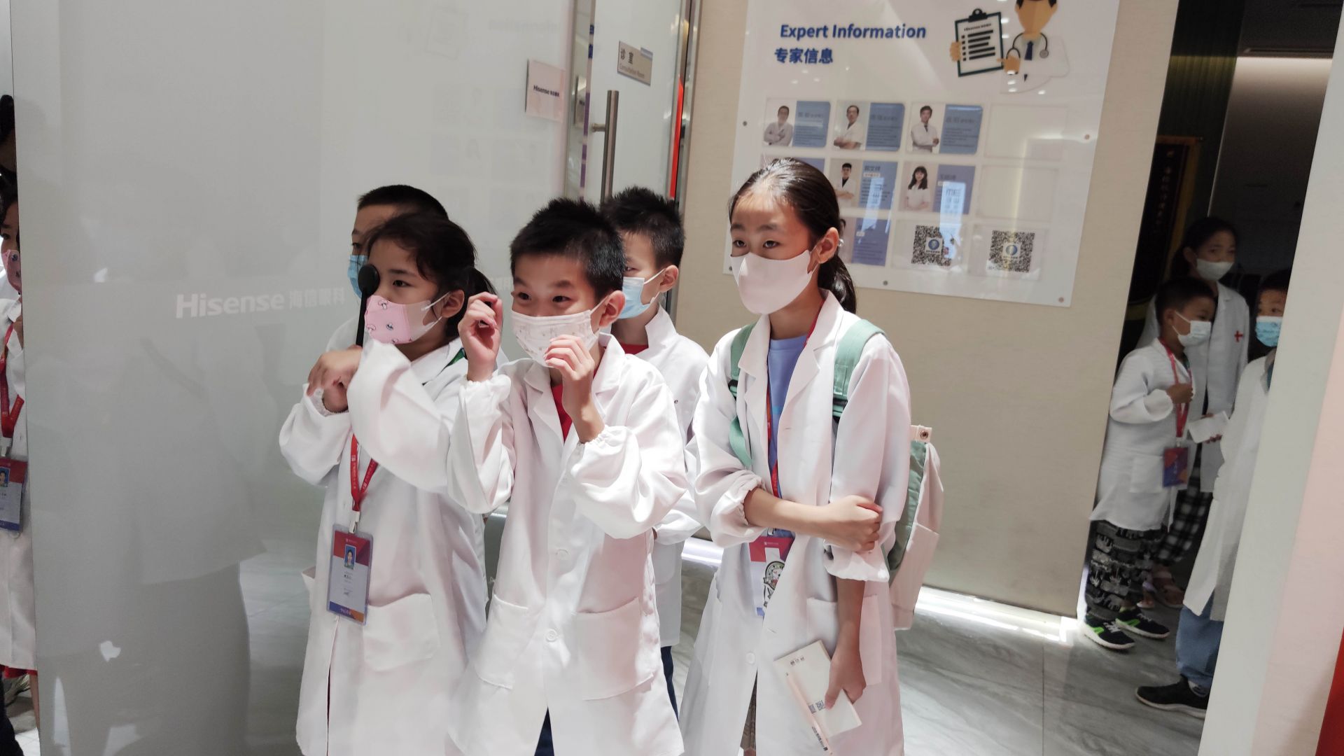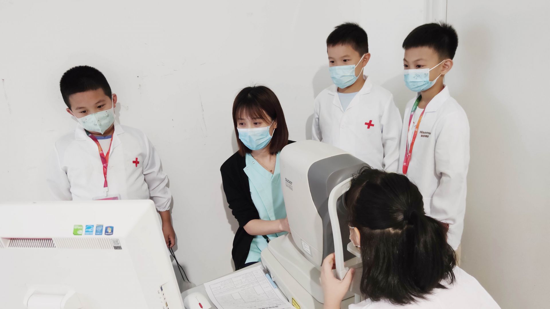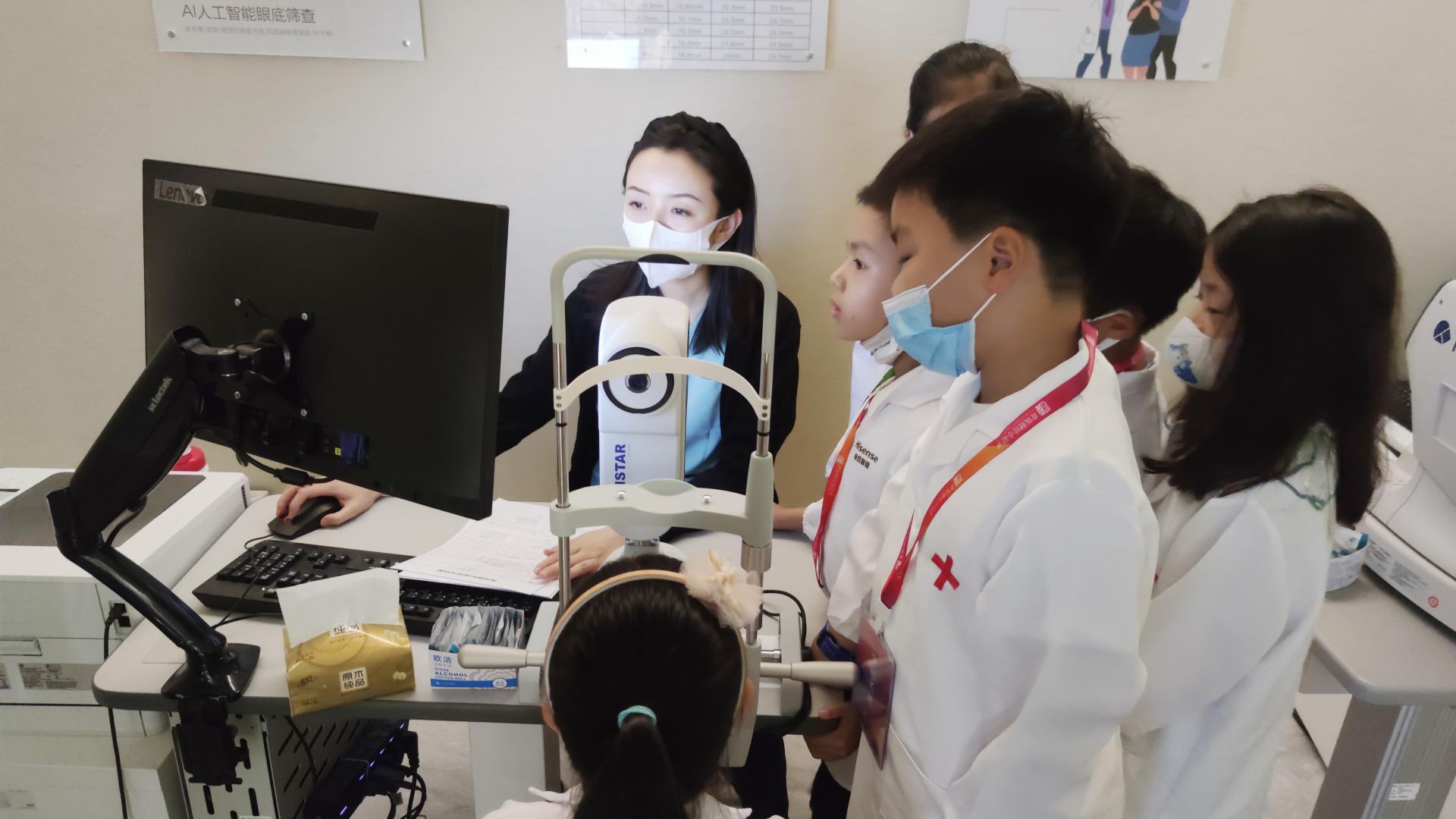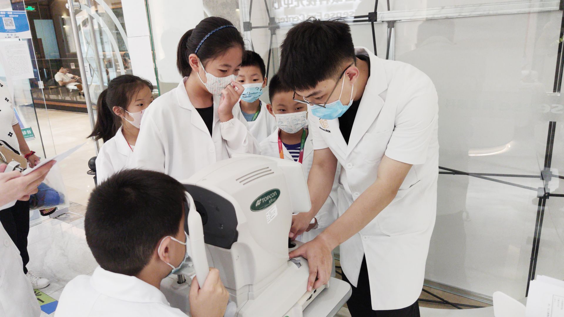 科普知识课堂结束后,就是最受小记者们欢迎的“体验眼科小医生”环节了。小记者们在工作人员的帮助下,穿上专属的白大褂,化身“眼科小医生”,开始了“岗前培训”。小记者们参观了海信眼科视光中心,了解眼科医生的工作环境、工作职责,了解诊疗仪器的使用方法。