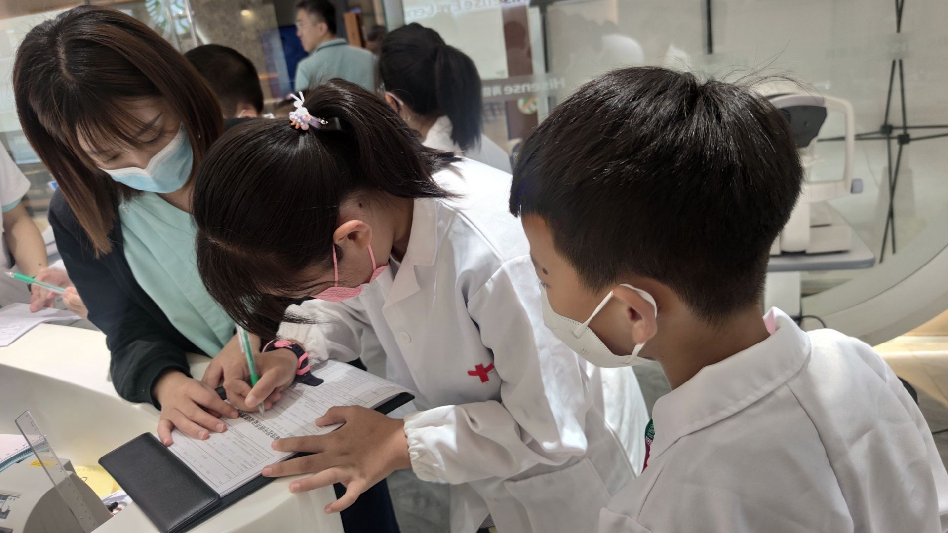 海信眼科视光中心的眼科专家还为参加活动的小记者们建立了“视光档案”,并安排了一次包括普通视力检查、眼轴长度测量等项目的眼部健康体检。最后小记者们还采访了眼科专家。