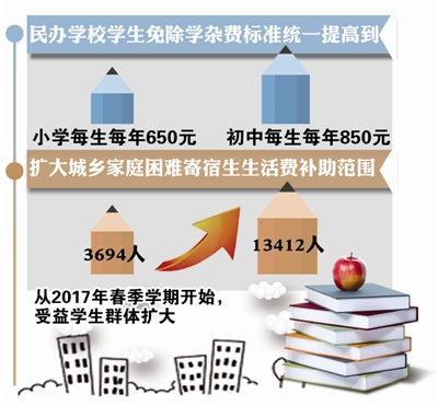 为提高教育质量,我市不断加大投入,进一步完善城乡义务教育经费保障机制。据悉,我市从2016年春季学期开始,在前期为全市义务教育段全体在校学生(含民办学校学生)免费提供教科书、免费提供作业本的基础上,增加投入1350万元以提高民办学校学生免除学杂费标准。目前,我市民办学校学生免除学杂费标准统一提高到小学每生每年650元、初中每生每年850元。此外,我市还增加投入724万元用于民办学校生均公用经费,使得义务教育民办学校首次和公办学校享有同等的公用经费保障。