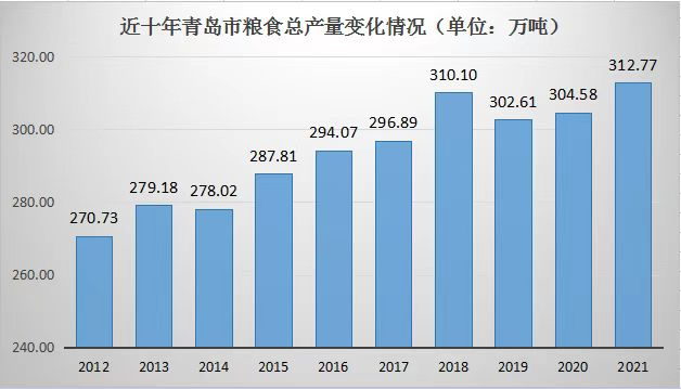粮食安全是关系国民经济发展、社会稳定和国家自立的全局性重大战略问题。2021年,青岛市粮食产量达到峰值312.77万吨,粮食作物平均亩产434.35公斤,再创历史新高。