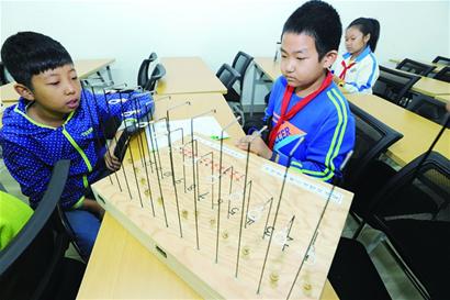整齐排列的12组支架上,垂下12根吊锤,随着整个仪器的震动,吊锤左右前后晃动,碰触到高低不同的线圈,就能形成回路,点亮下侧的震级显示灯……15日上午,记者走进手工创客比赛小学组赛场时,来自南京路小学的于振瀚正在向评委展示自己的参赛作品——地震震级监测及演示装置,很难想象,这样复杂的作品出自一名五年级小学生之手。“我之前见到过有人用一组支架演示地震震动,但没有办法准确表达震级。我就想能不能用多组支架,来测定演示地震震级。 ”赛后,于振瀚告诉记者,因为爸爸从事机械电子工作,从小开始,他每次跟着爸爸去单位加班时,都会摆弄工作桌上的各种仪器设备,早早对机电产生了兴趣。