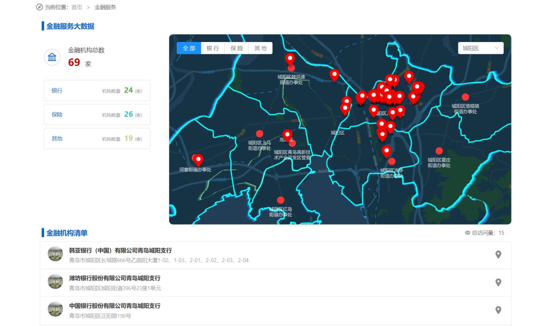 四是金融服务。平台汇集全区金融类企业70家,包含:25家银行、26家保险公司、近20家其他融资平台,后续将在平台发布相关惠企内容,为有需求的项目和企业提供“定制化”金融服务。下一步将吸引更多基金、证券、保险等机构在平台集聚,打造高效的银企、金企对接平台。