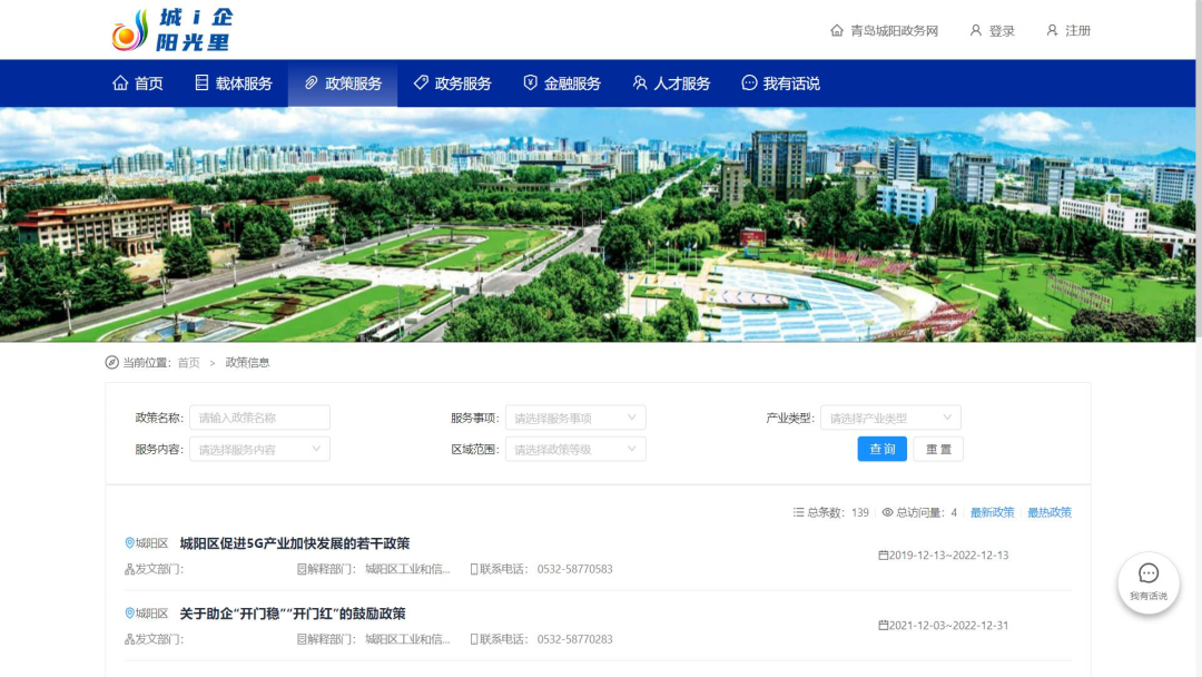 “城i企 阳光里”可查询各项政策服务页面截图