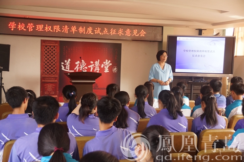 孙洪传校长介绍,学校以完善多元治理体系,提高治理能力为目标,坚持法治思维和法治方式,认真贯彻落实教育法律法规,以梳理权力责任清单、优化运行流程、强化监管评价为核心,从规范权力运行和便民高效的角度,将由学校行使、具有法律法规依据的、对学生、家长、教师和其他相关利益者的权利义务产生直接影响的教育教学管理权限类、学生管理权限类等五大类35项行政职权,逐项将实施依据、工作流程、承办机构、监督投诉机构等,以清单形式明确列示,并向社会公布,接受社会监督。