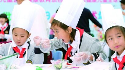 在活动现场,为提高孩子们的参与性,主办方专门设置了趣味游戏环节,如趣味障碍跑、营养搬运工、穿越火线、膳食宝塔等。 “我平时可不喜欢吃茄子,现在嘛,有机会可以品尝一下啦! ”围着围裙,正“一本正经”为自己制作沙拉的小学生徐卓然俏皮地说。