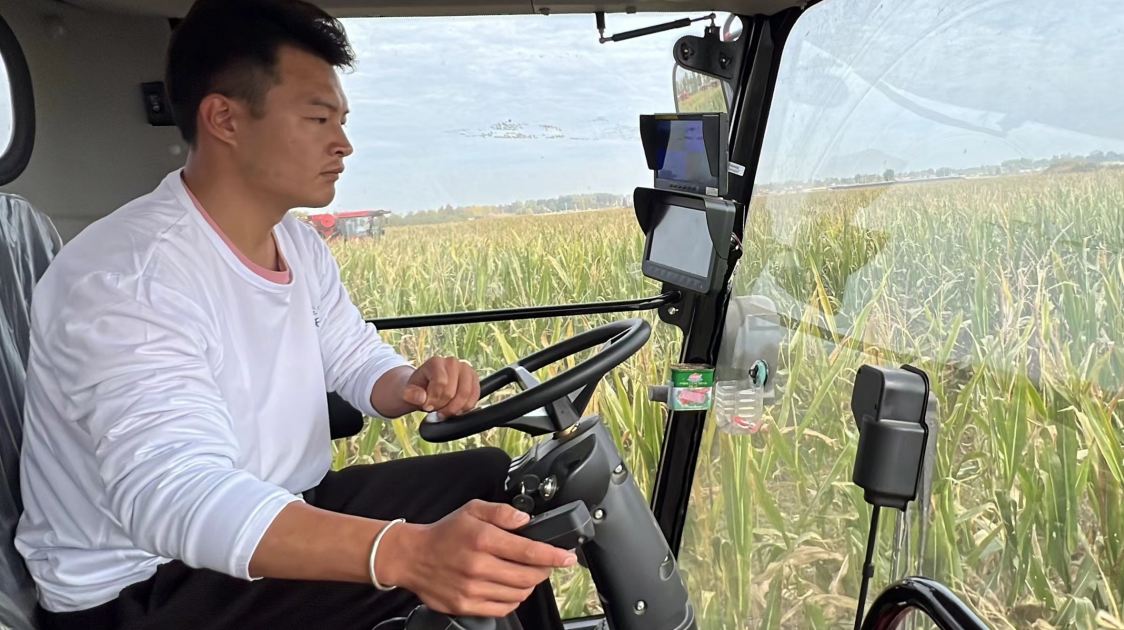 参赛选手在驾驶室操控进行玉米机收