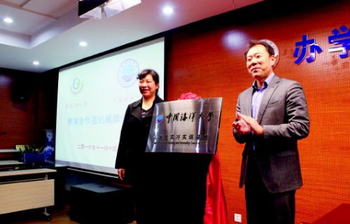 当天下午,青岛二中分校与中国海洋大学数学院支持学生优势发展合作签约揭牌仪式在二中分校会议室举行。会议上,青岛二中、青岛二中分校校长孙先亮与中国海洋大学教务处处长方奇志签署教育合作协议并共同为中国海洋大学大学生实习实训基地揭牌。