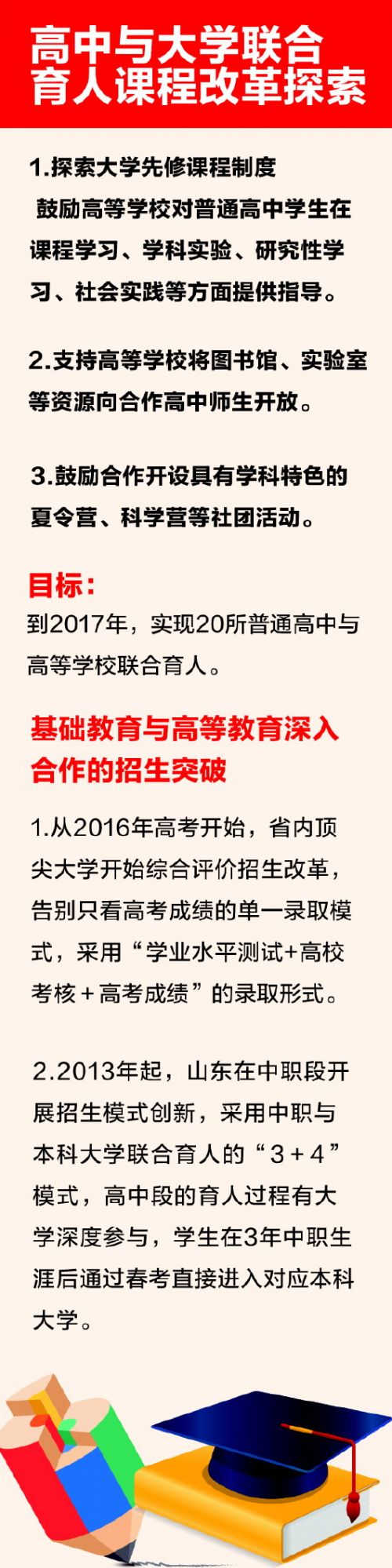 根据青岛市最新中小学课程改革的要求,青岛将探索普通高中学校与高等学校合作开发学校课程、合作培养创新人才的机制。到2017年,实现20所普通高中与高等学校联合育人。