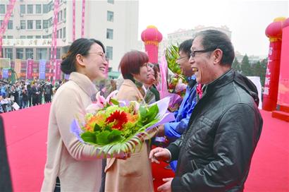 学校还特别邀请了90余名退休老教师一起庆祝这个特殊的日子。在献花环节,两名满头银发的老人紧握双手,站在舞台上久久不愿离开,原来他们是青岛19中的首批师生。老师孙德伦今年已经82岁,是学校建校时的第一批老师。学生丁树理今年74岁,则是学校建校时的首批学生。 “初中和高中都是在19中上的学,1962年毕业后就再也没有见过孙老师。 ”丁树理说,但他心里依然会挂念着这位教导过自己的好老师。“孙老师教过我生物和政治,他的课很有意思,跟我们的关系也很好,是那种亦师亦友的关系。 ”丁树理说。