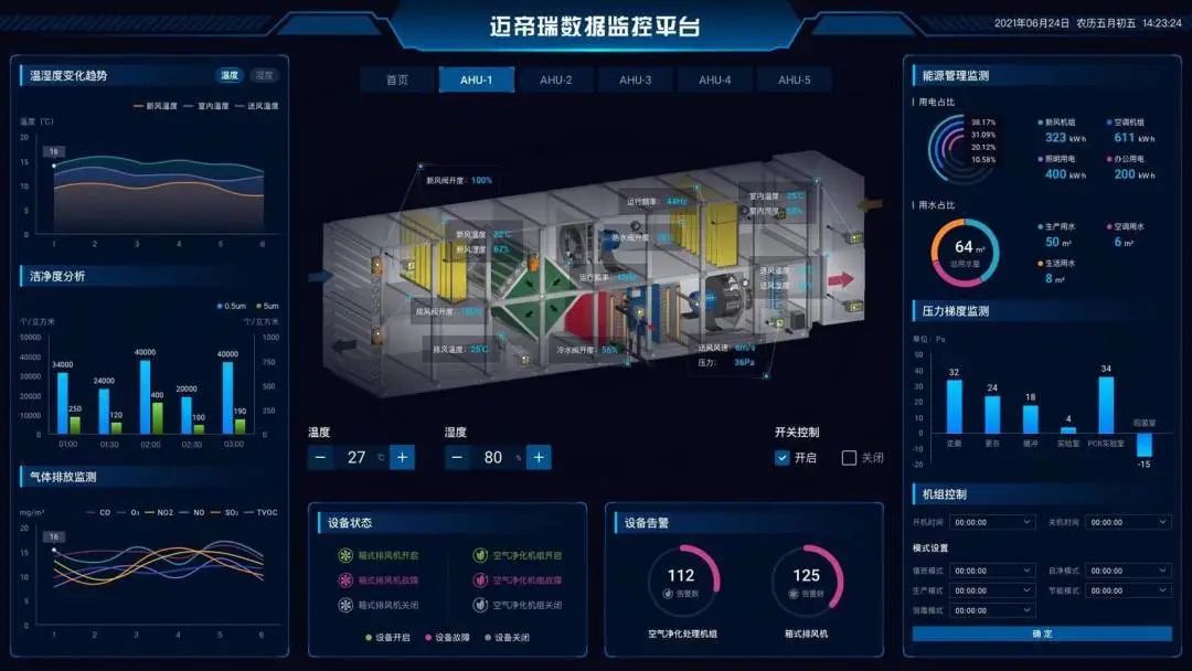 生产环境直接影响医疗器械的品质,为保证厂房的洁净生产,迈帝瑞为其提供设计、施工、运维全周期、软硬一体的净化解决方案,包括自主研发的空气处理机组等硬核设备,定制“AIoT环境管理平台”,实现GMP车间洁净度、温湿度、压力梯级的精准控制,打造安全洁净的生产环境。