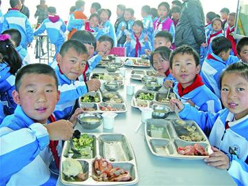 新政实施后,校方有能力考虑给孩子们按营养要求配餐了,崂发小学的学生午餐标准也从原先的一荤一素外加一汤,变成了两荤一素,天天有酸奶和汤。