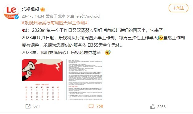 1月3日,乐视视频官方微博宣布,2023年1月1日起,公司将执行每周四天半工作制,即每周三实行弹性的半天工作制,考勤时间调整为连续的5小时,比如上午10点至下午15点、上午11点至下午16点都是符合规定的。