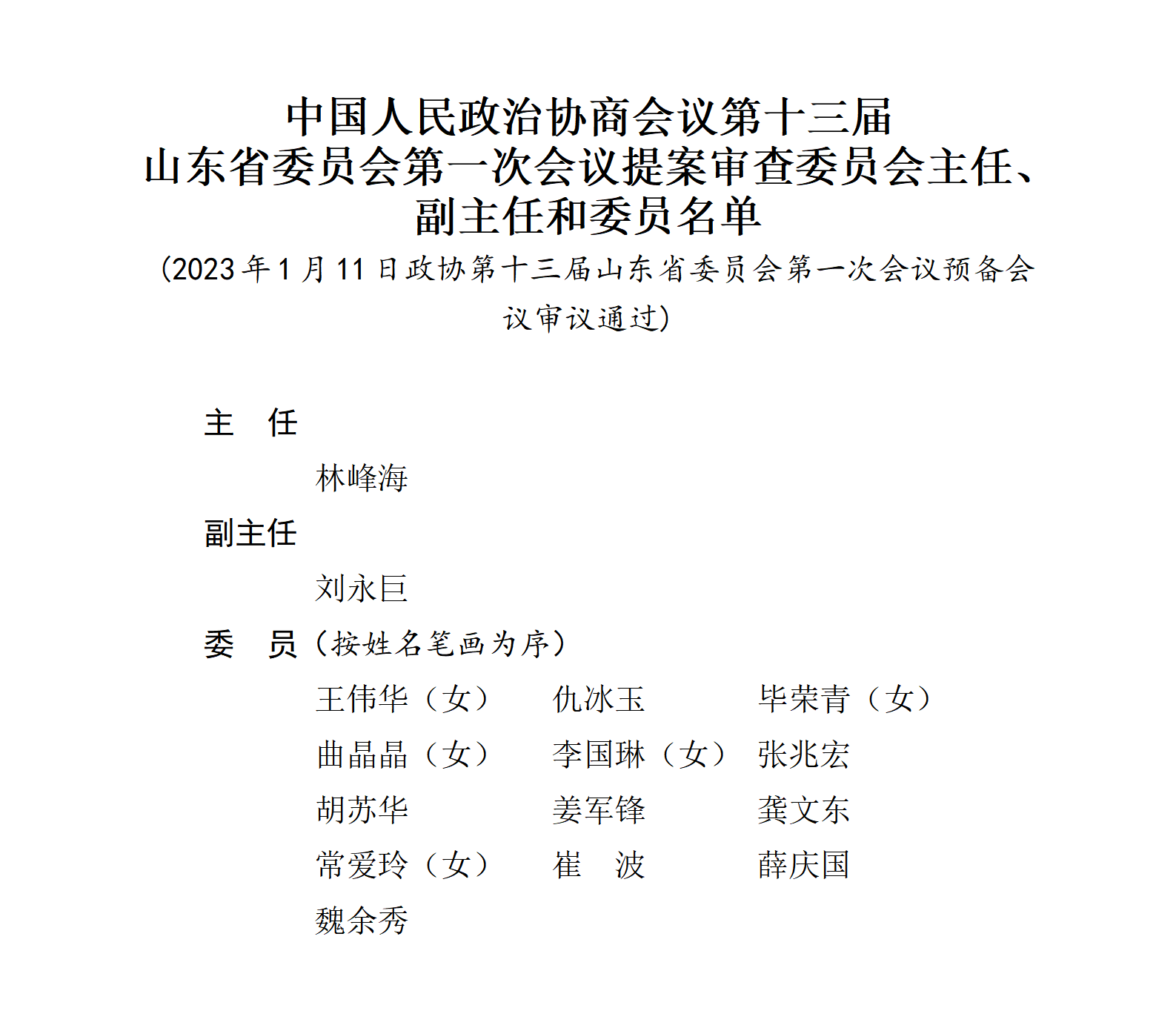 中国人民政治协商会议第十三届山东省委员会第一次会议提案审查委员会主任、副主任和委员名单