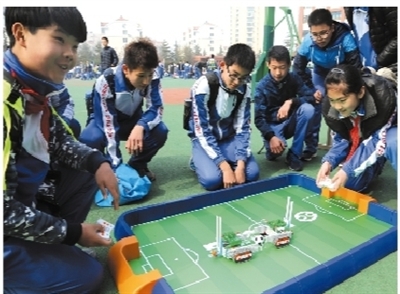 在学校第八届科技节上,学生进行机器人足球比赛。