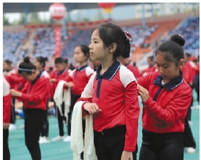 “争做第一反应人”——李沧路小学学生展示肩背包扎急救术。