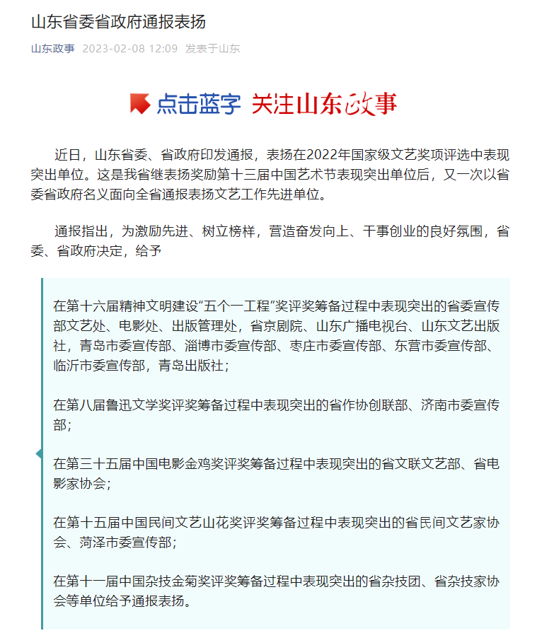近日,山东省委、省政府印发通报,表扬在2022年国家级文艺奖项评选中表现突出单位。青岛出版社获通报表扬。