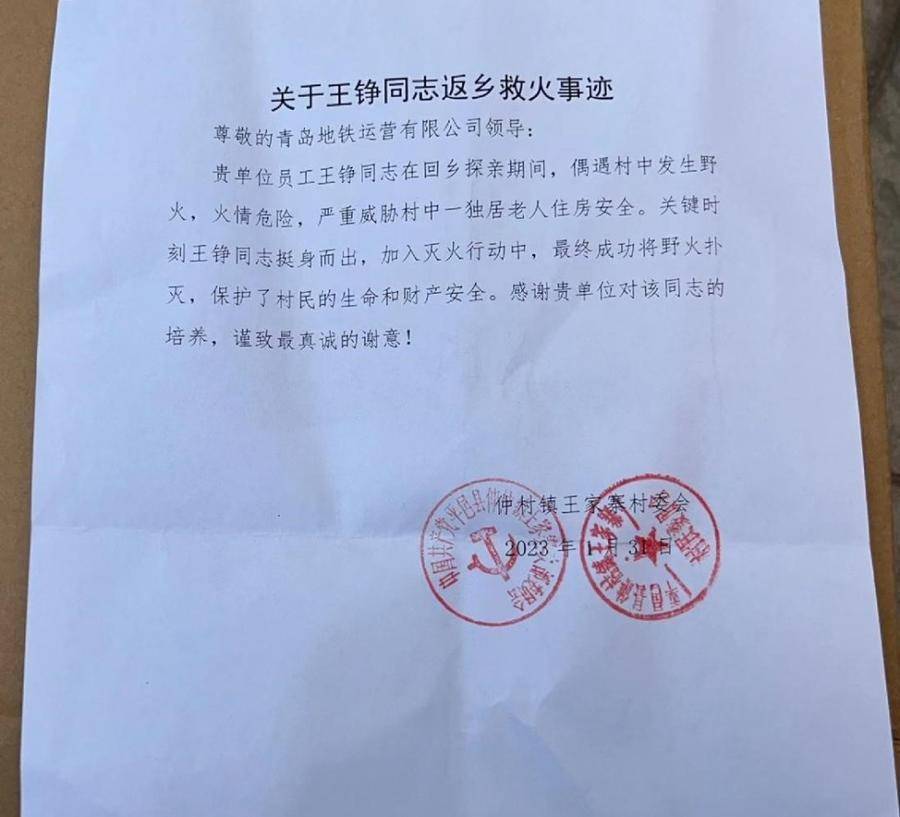 这场救火行动中,王铮的英勇表现得到村民的一致肯定,王家寨村村委会在感谢信中说:“关键时刻王铮同志挺身而出,加入灭火行动中,最终成功将火扑灭,保护了村民的生命和财产安全。感谢青岛地铁对王铮的培养,谨致最真诚的谢意!”