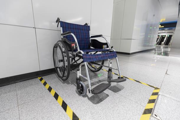 电梯内设有安全扶手,方便轮椅及腿脚不便的乘客进出站乘车。个别不具备完整无障碍通行条件的车站内会加装楼道升降机。青岛地铁各站台均存放无障碍折叠垫板,操作简单、不占空间,可铺设在站台与列车之间,为轮椅乘客提供更加便捷的上下车服务。车站设置无障碍卫生间,卫生间内配备了无障碍洗手台、无障碍坐便器、安全扶手等基础设施,为特需乘客出行提供便利。服务中心配有无障碍窗口,工作人员为有需要的乘客提供咨询、引导等服务。同时,地铁站内还存放爱心轮椅,若有乘客需要,可随时联系工作人员。此外,站内、站外地面设有盲道,车站内步梯扶手的起始及转弯衔接处、直梯按键等设施设置盲文提醒,能够有效引导视障乘客安全乘车,让视障乘客在车站多一双“明亮的眼睛”。