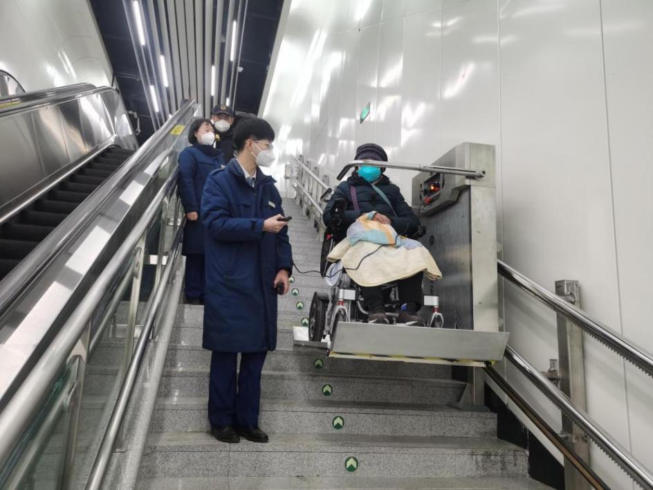 工作人员操作楼道升降机护送乘客出行