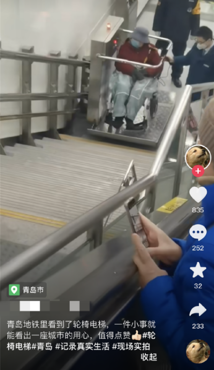 视频里,老人所乘的轮椅被整体送上升降机,两名工作人员全程陪伴在老人身侧和身后,升降机沿着步行楼梯平稳拉升。“青岛地铁里看到了轮椅电梯,一件小事就能看出一座城市的用心,值得点赞。”视频作者这样写道。