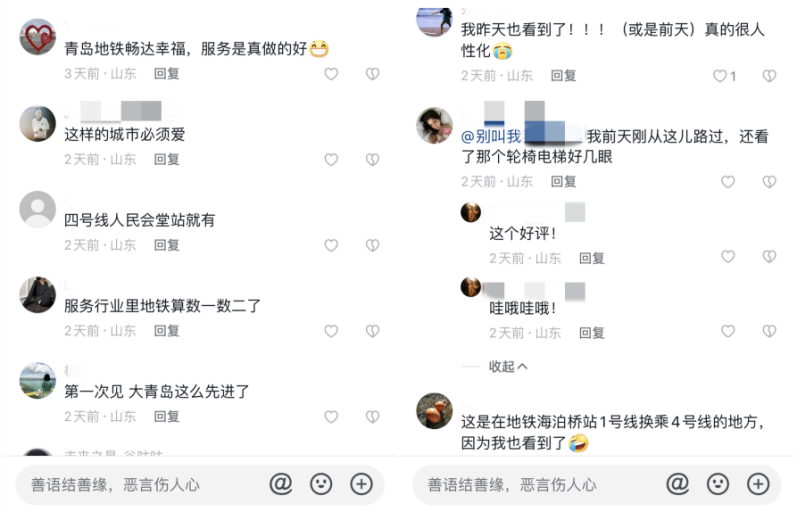 “很人性化的服务设施,给青岛地铁点赞!”“这项服务设施太给力了,给青岛地铁一个好评!”