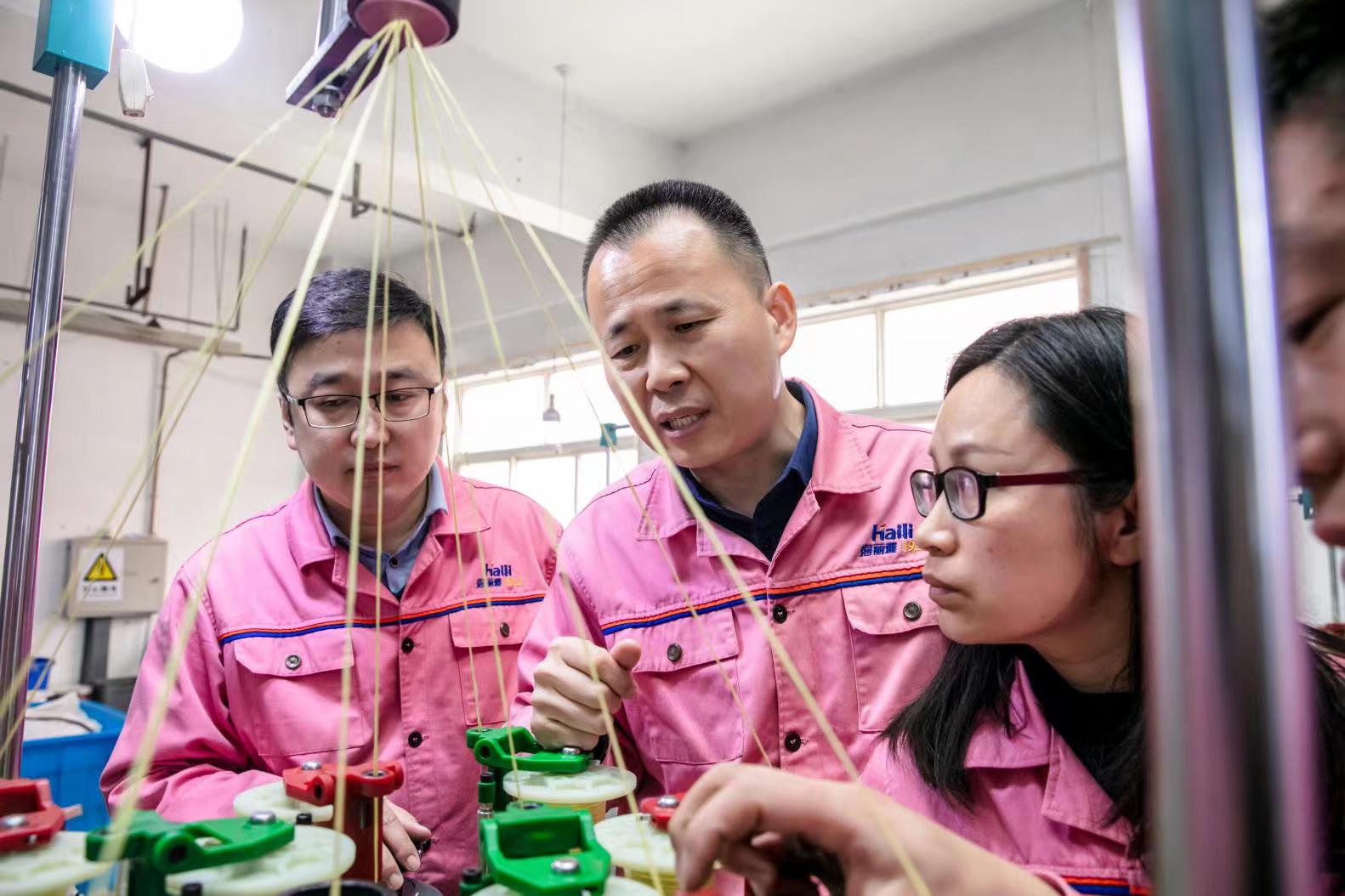 海丽雅技术人员在特种绳缆车间研究绳缆生产工艺情况