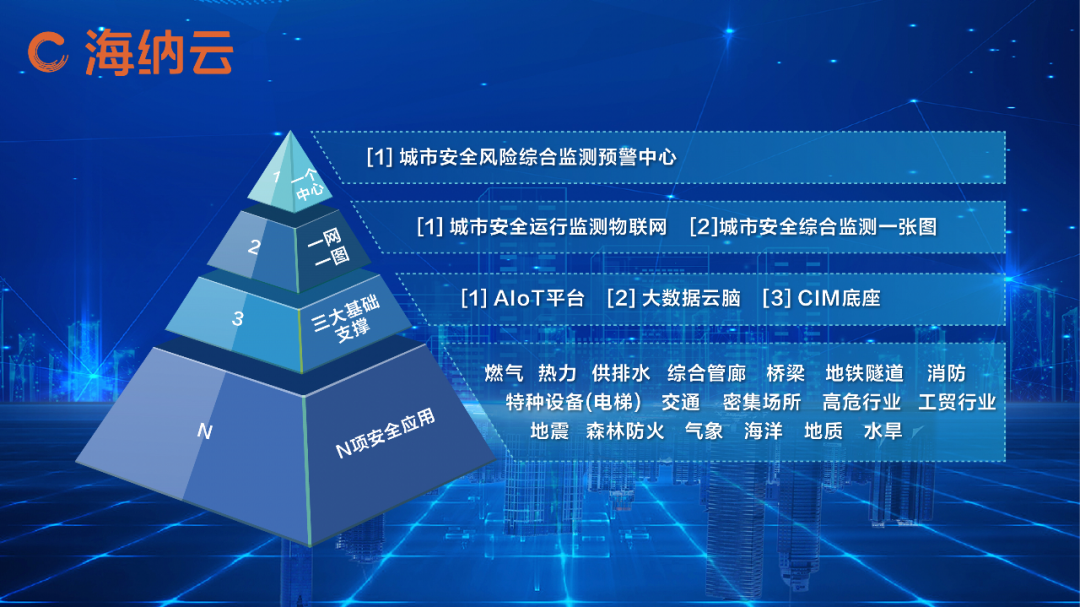 依托“星海数字平台”,海纳云采用“1+2+3+N ” 顶层设计,即1个中心(城市安全风险综合监测预警中心),一网一图(城市安全运行监测物联网、城市安全综合监测一张图),3大基础支撑(AIoT平台、大数据云脑、CIM底座),N项应用(燃气、热力、供水、排水、消防、电梯等),形成一体化“城市安全风险综合监测预警指挥体系”,赋能燃气、供排水等场景应用,打造“城市应急感知一张网”,构建“一网统管”智慧应急体系,实现城市安全治理“风险清、底数清、隐患清”,形成“能监测、能预警、能分析、能处置”的全流程闭环防控机制。