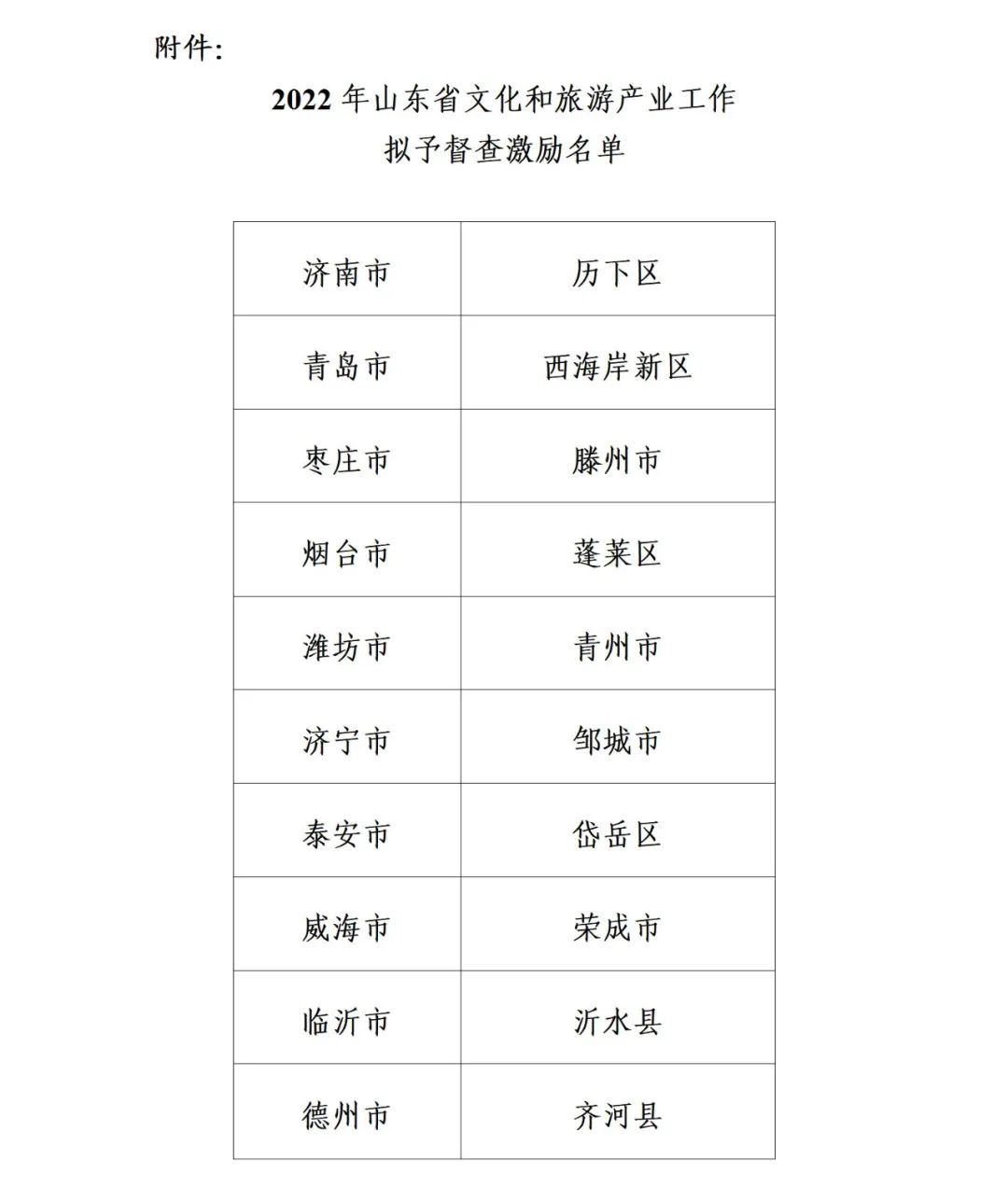 关于2022年山东省文化和旅游产业工作拟予督查激励名单的公示