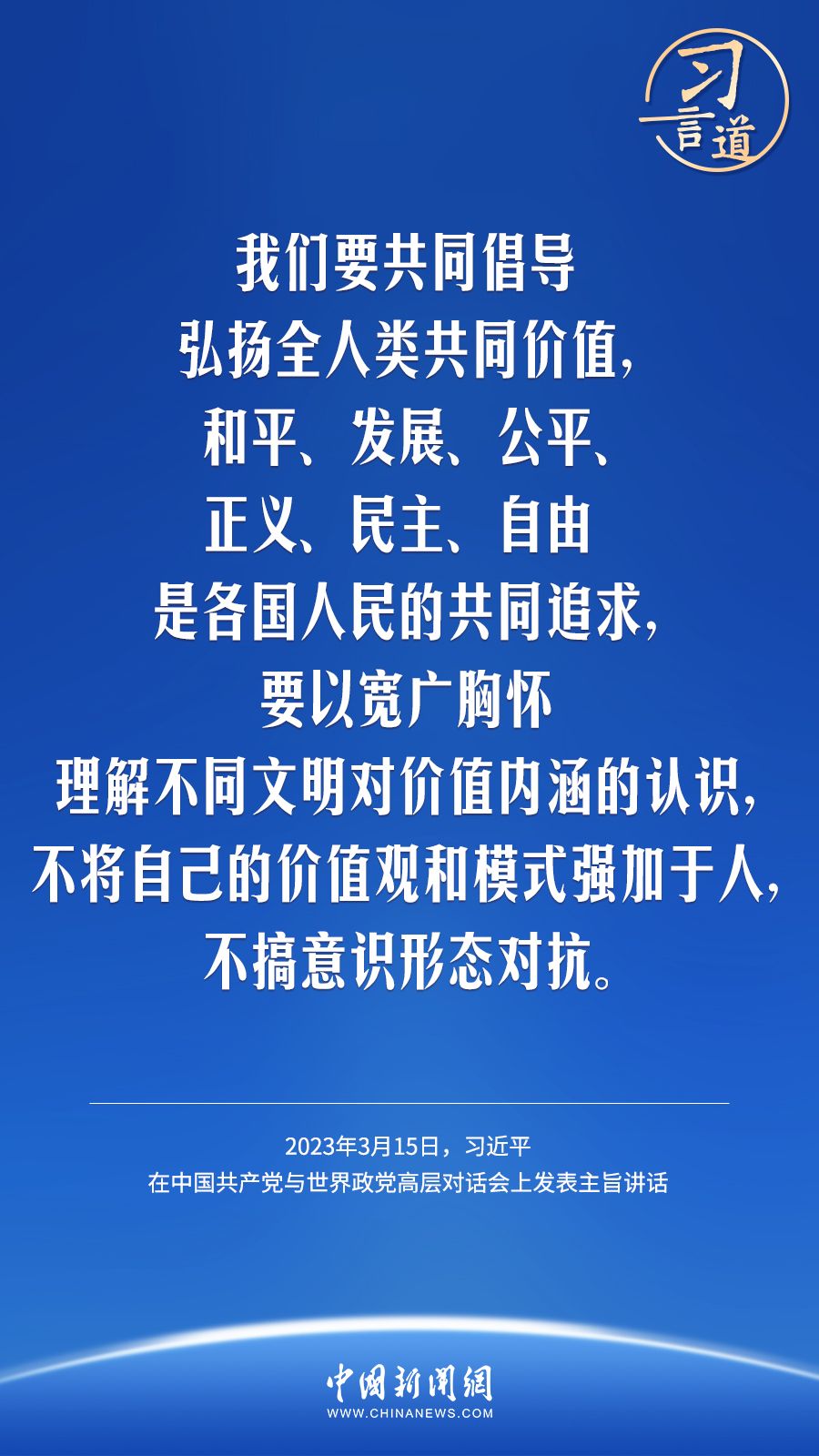 习言道|以文明交流超越文明隔阂 2023-03-17 08:48 0 3月15日,中共中央总书记、国家主席习近平在北京出席中国共产党与世界政党高层对话会并发表主旨讲话。会上,习近平提出全球文明倡议—— 来源:中国新闻网 责任编辑:崔现香