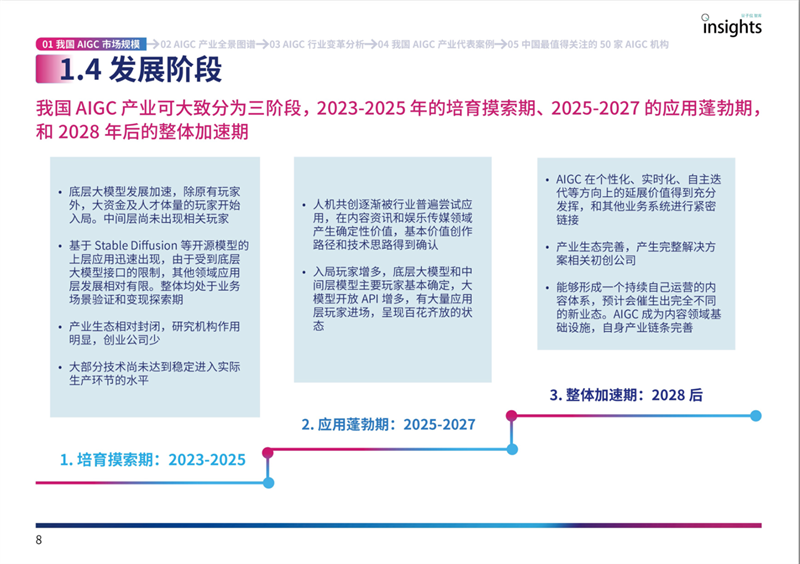 报告内容主要涵盖了五个部分:我国AIGC市场规模测算、AIGC产业全景图谱、AIGC行业变革分析、我国AIGC代表案例及AIGC 50。