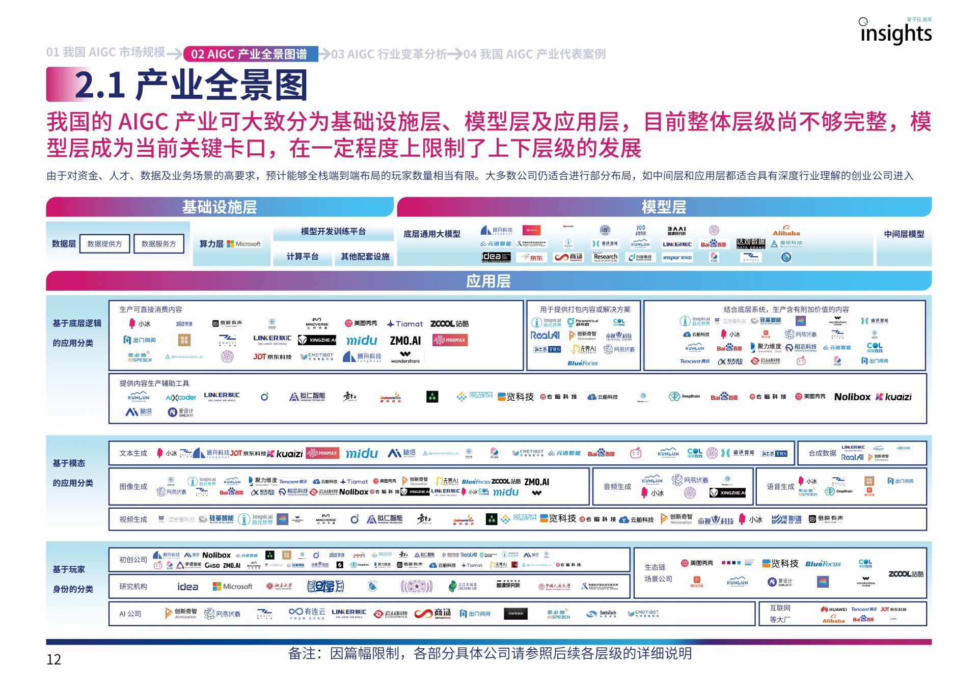 应用层业务则更为丰富,比如基于底层逻辑划分,包括生产可直接消费内容、结合底层系统生成含附加价值内容、提供内容生产辅助工具、用于提供打包内容或解决方案等。
