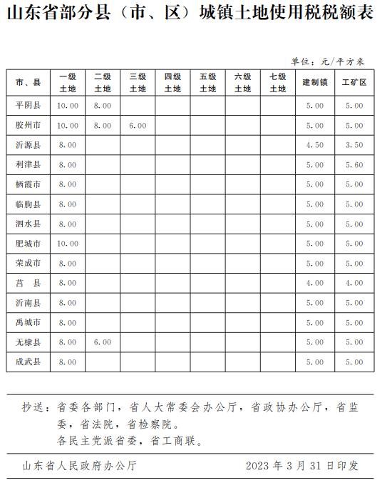 一、调整平阴县、胶州市、沂源县、利津县、栖霞市、临朐县、泗水县、肥城市、荣成市、莒县、沂南县、禹城市、无棣县、成武县城镇土地使用税税额标准,调整后的税额标准按照《山东省部分县(市、区)城镇土地使用税税额表》(见附件)执行。