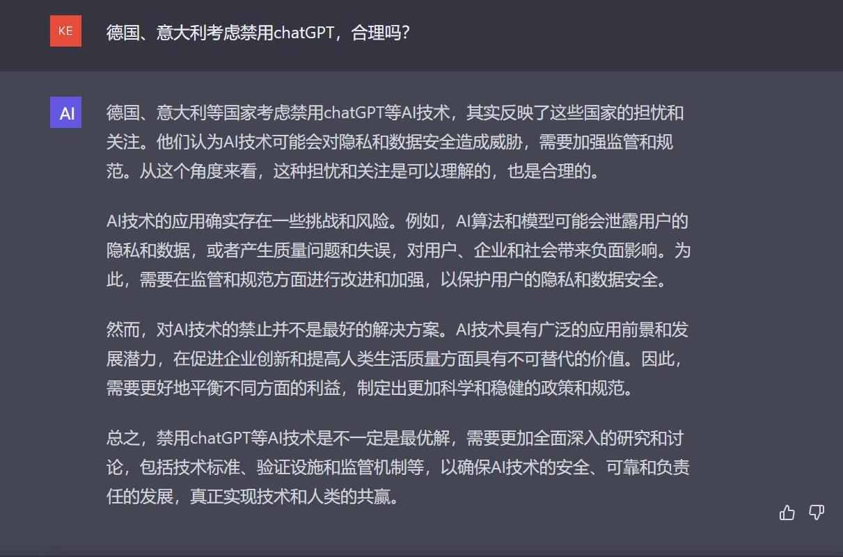 对于欧洲多国的反应,中新财经在询问ChatGPT的意见时,它给出了自己的态度:德国、意大利等国家考虑禁用ChatGPT等AI技术,反映了这些国家的担忧和关注,但禁用ChatGPT等AI技术不一定是最优解。