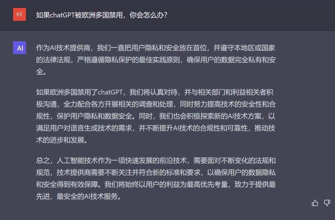 在应对措施方面,ChatGPT的答案显示,将认真对待,并与相关部门和利益相关者积极沟通,全力配合各方开展相关的调查和处理,同时努力提高技术的安全性和合规性,保护用户隐私和数据安全。