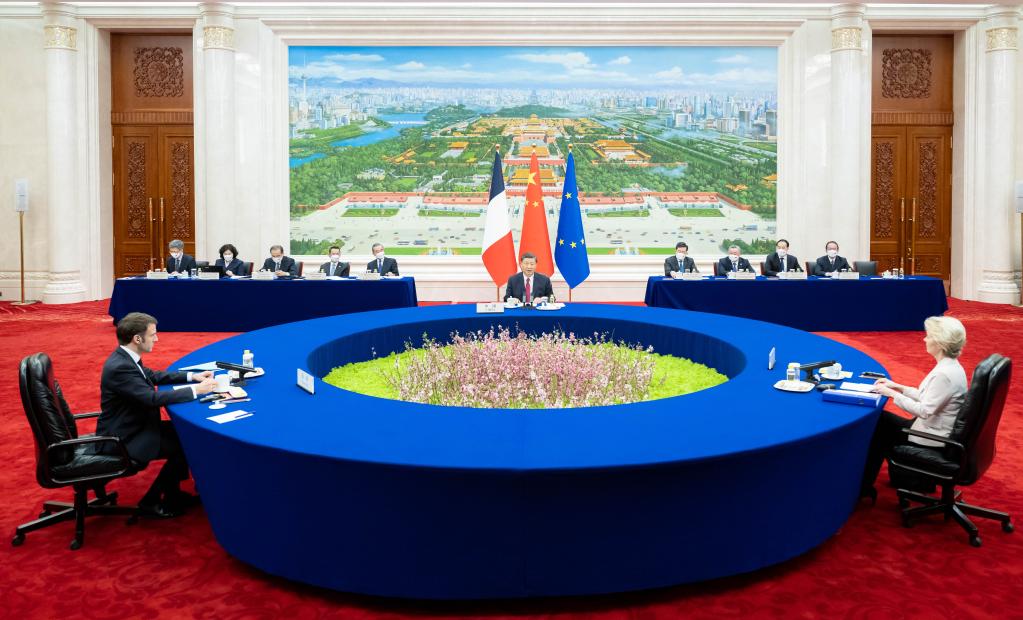 4月6日下午,国家主席习近平在北京人民大会堂同法国总统马克龙、欧盟委员会主席冯德莱恩举行中法欧三方会晤。新华社记者 翟健岚 摄