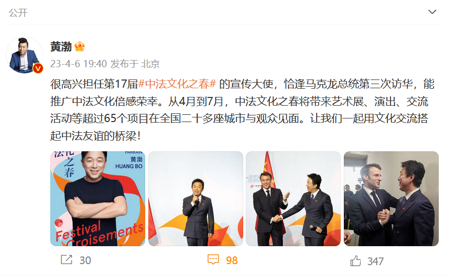4月6日,黄渤微博晒与法国总统马克龙同框握手照,他表示:“很高兴担任第17届中法文化之春的宣传大使,恰逢马克龙总统第三次访华,能推广中法文化倍感荣幸。”