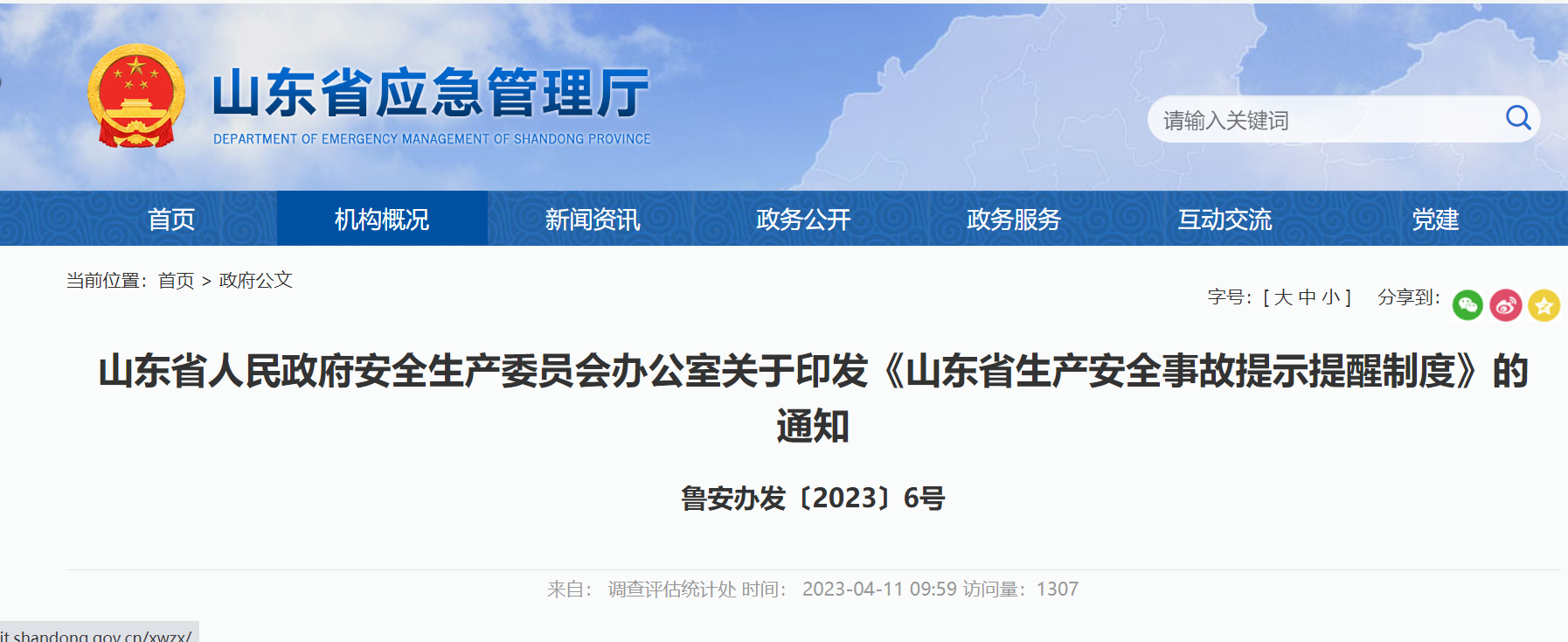 山东省政府安委会办公室近日印发《山东省生产安全事故提示提醒制度》,出现区域性、阶段性、苗头性的同类事故多发情况,省政府安委办将及时向有关地区和行业部门发出提示提醒,进一步压紧压实安全生产责任。