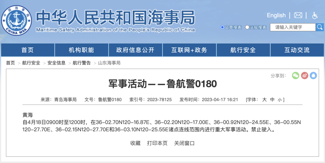 自4月18日9时至12时,在36-02.70N120-16.87E、36-02.20N120-17.00E、36-00.92N120-24.55E、36-00.55N120-27.70E、36-02.15N120-27.70E和36-03.10N120-25.55E诸点连线范围内进行重大军事活动。禁止驶入。