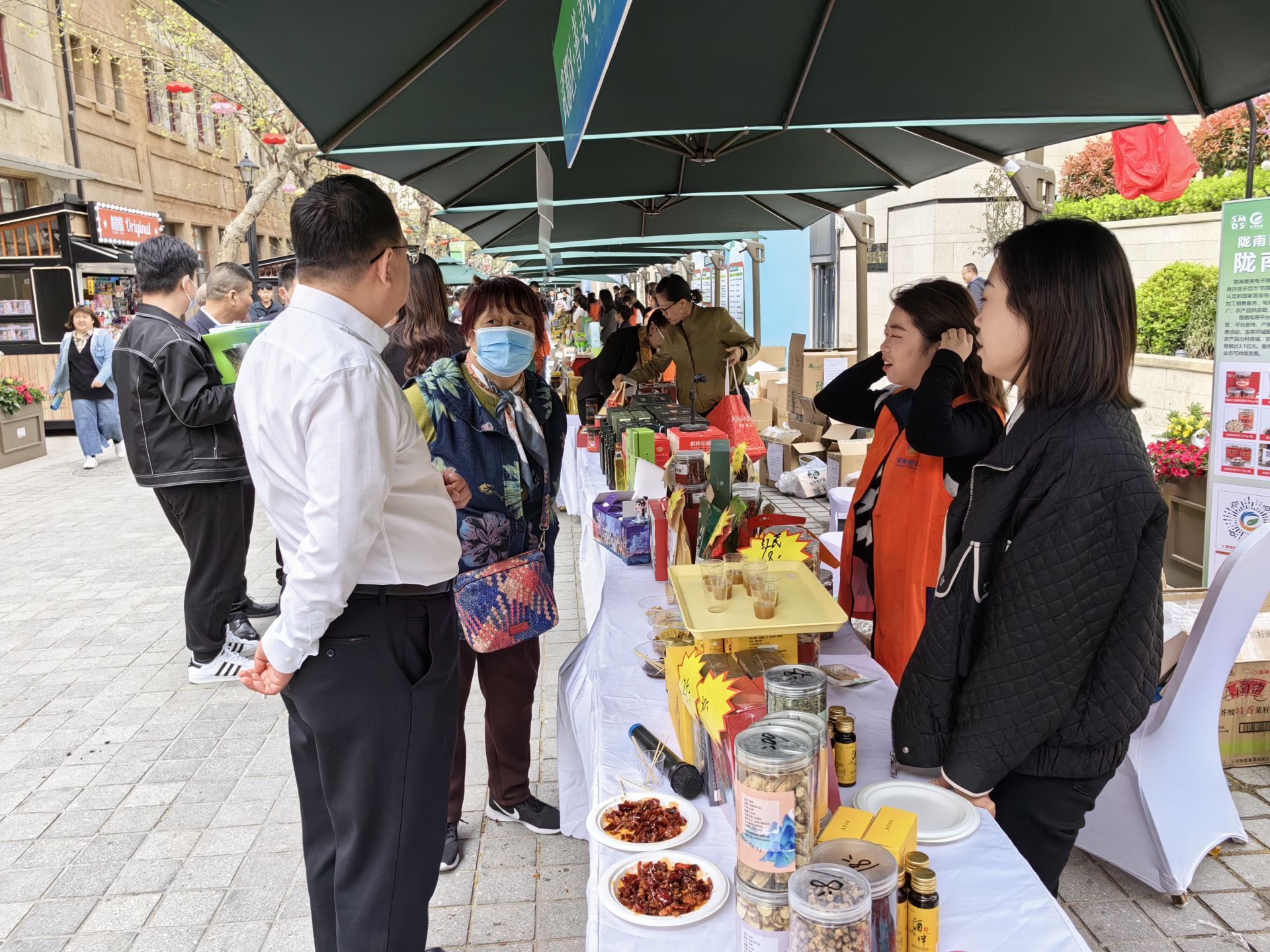 本次活动为期三天,陇南市优选组织30余家农特产品企业在青岛市北区大鲍岛文化休闲街区布展,绿茶、油橄榄、中药材、苹果.....活动现场,陇南优质农特产品琳琅满目,产品丰富且地域特色明显,各类绿色优质农特产品备受喜爱,吸引了不少市民游客驻足购买。现场开展特色农产品体验品尝和免费赠送推广活动,同时在市南、胶州、即墨、崂山等市区设9个分会场,同步开展线上线下促销活动。