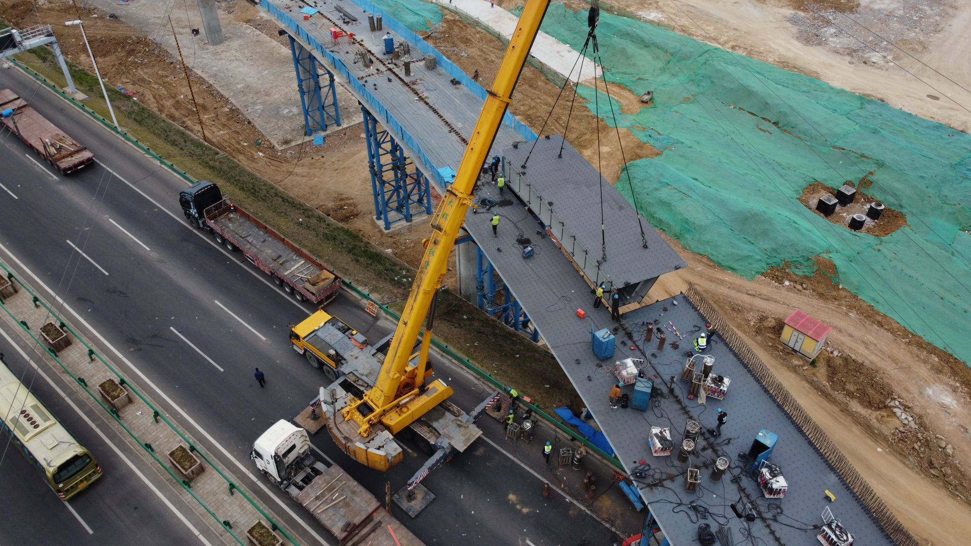 为顺利攻下难关,项目部多次邀请业内专家现场指导。经多次专家论证,持续优化工艺,项目部最终通过采用轨道滑移工法,辅以起重机械AI限位、电磁感应警报等技术,大大降低了临电作业风险,并将35天计划工期压缩至20天,将对地面交通的影响降到了最低,顺利解决了紧邻高压的跨线施工难题。