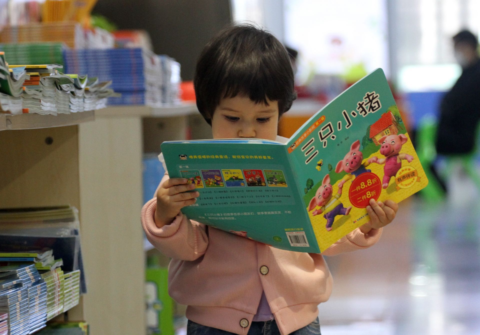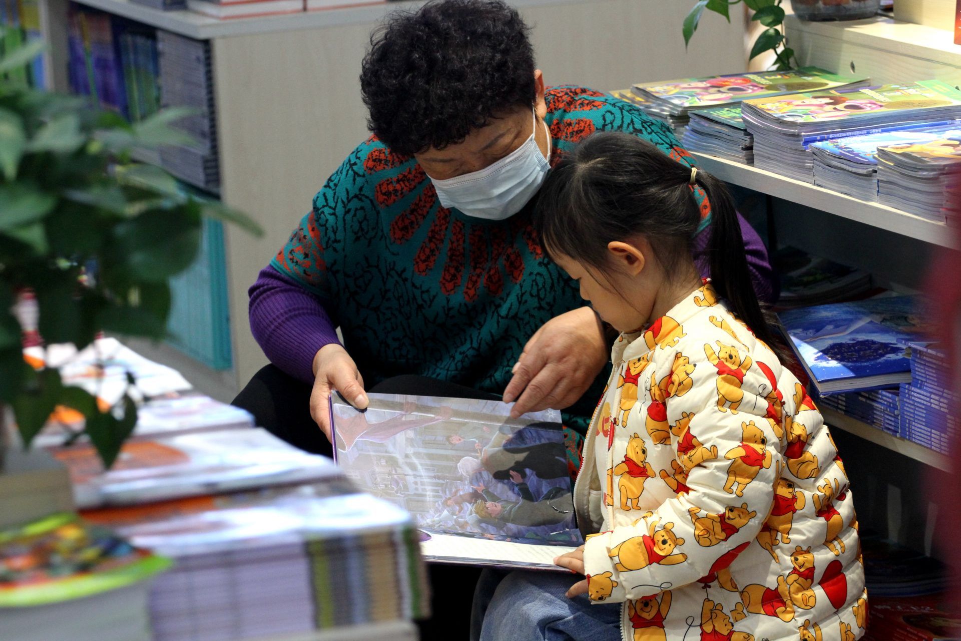 书城内,奶奶正与孙女一起读书。