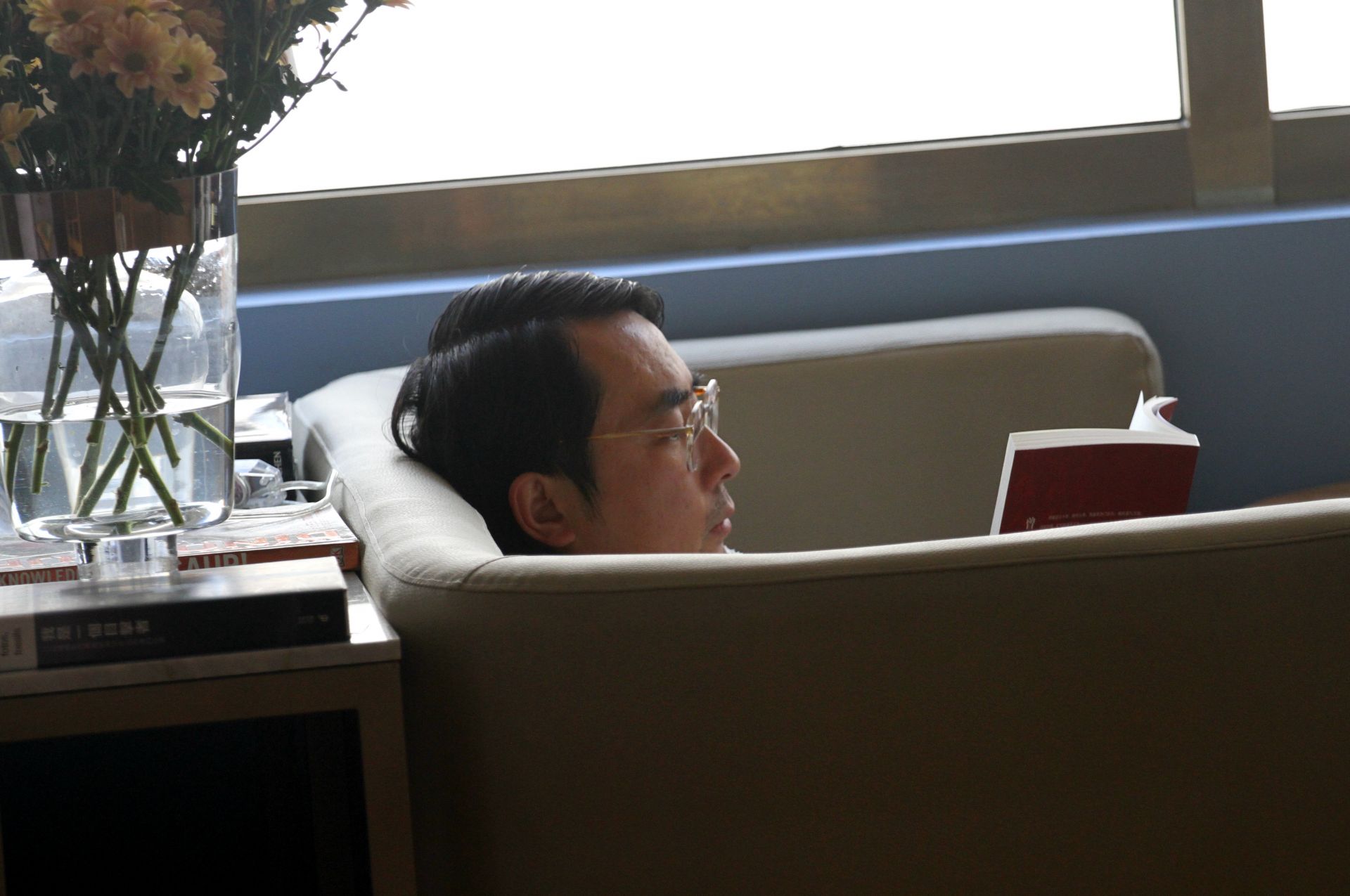 某咖啡吧,窗边正在看书的读者。